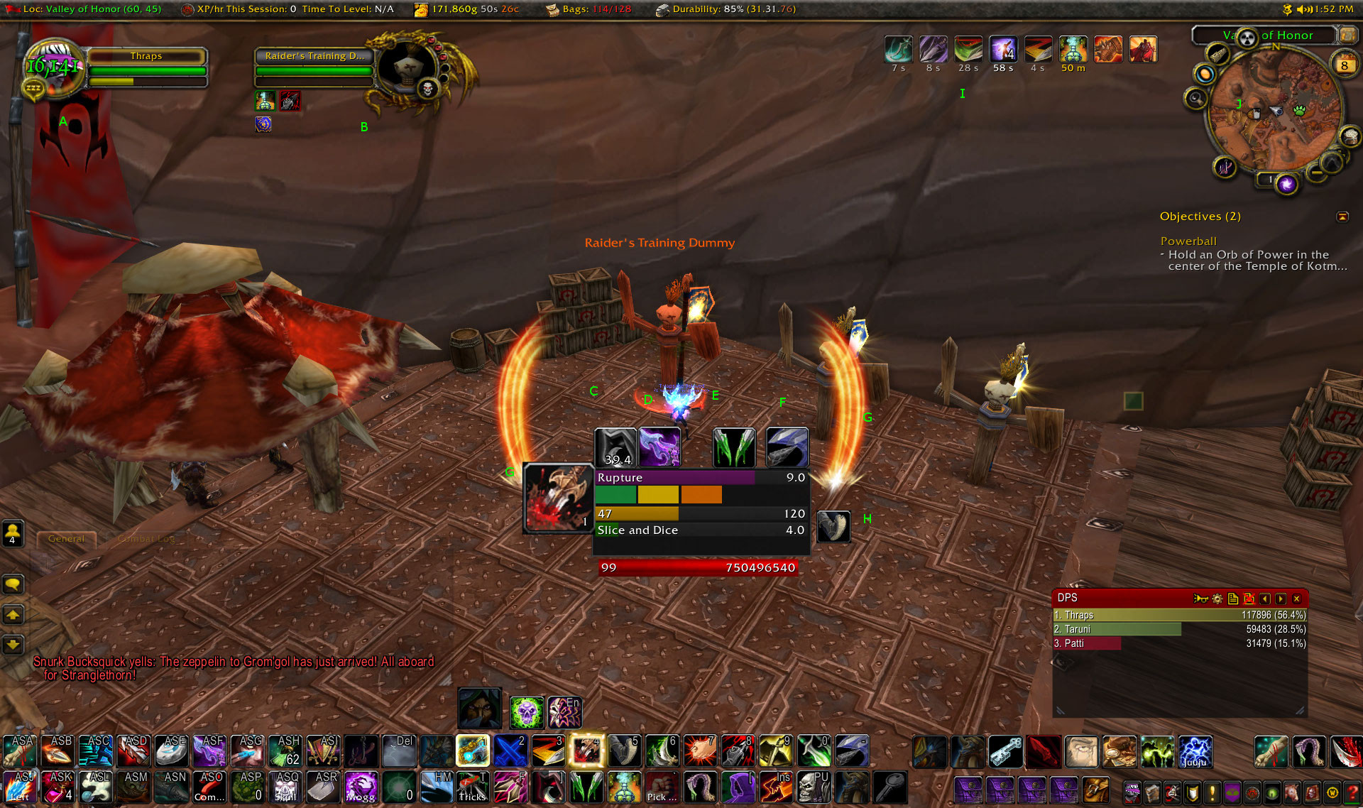 Coming back in to the central box on the screen, this is all of the most vital data I need to run combat. The bar marked Rupture is a timer counting down. This is an class specific ability I need to keep active on the enemy if combat is of any noteworthy duration. The bar marked Slice and Dice is likewise a countdown timer, but instead for a buff I apply to myself that’s a major source of damage output increase. The initial duration of both is determined by how many combo points, the green, yellow, and orange boxes between the timers, I have when I do it.